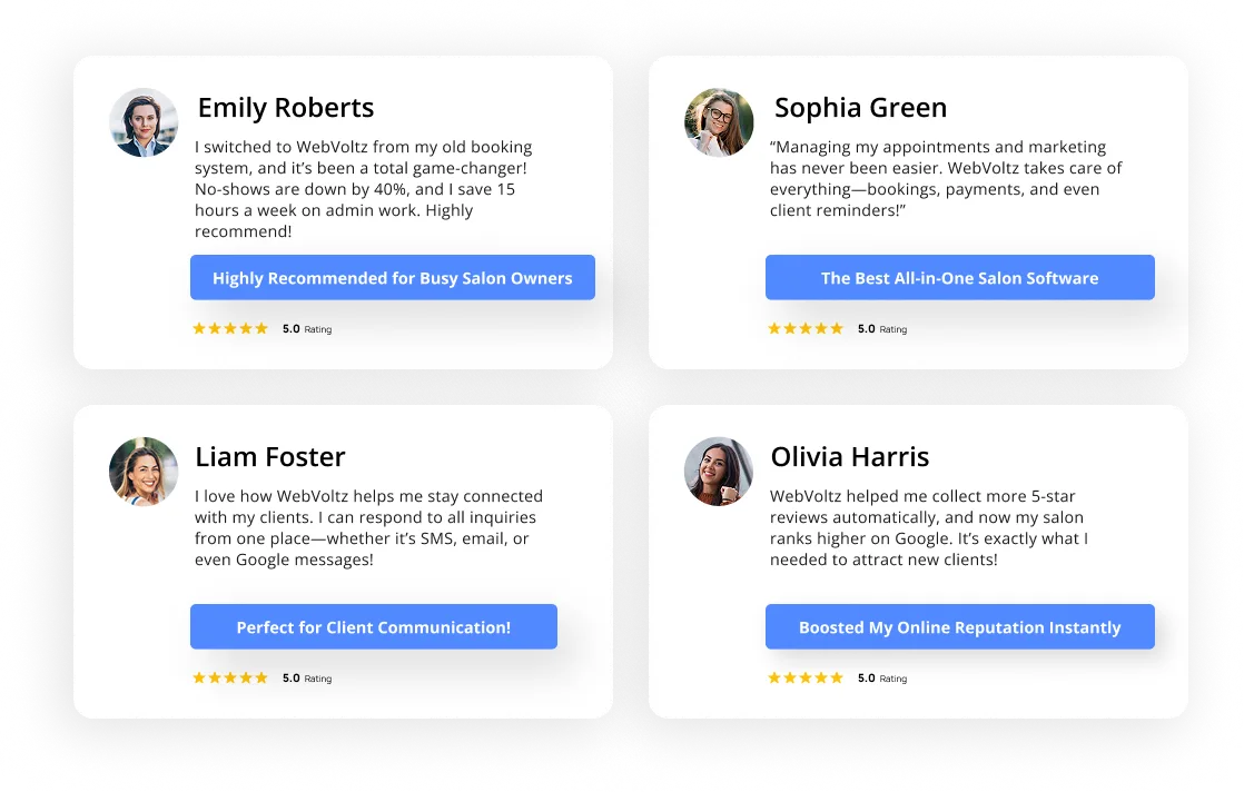 WebVoltz automatically requests 5-star reviews from happy clients, helping grow your salon’s online presence and attract new customers.